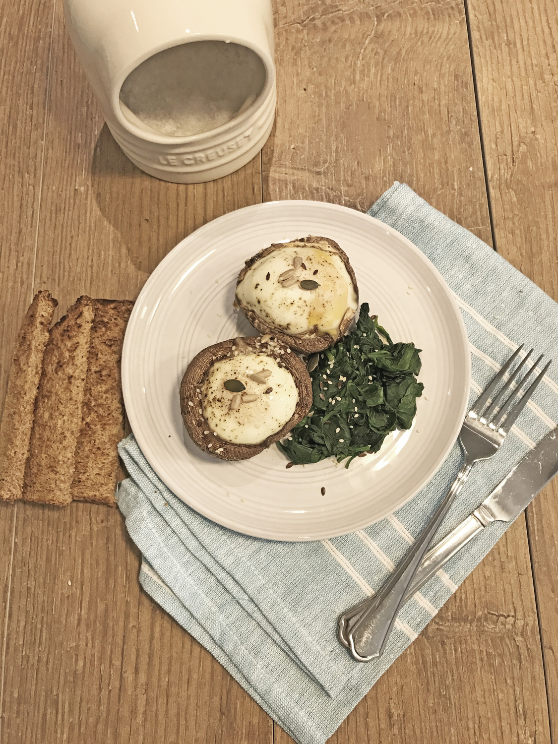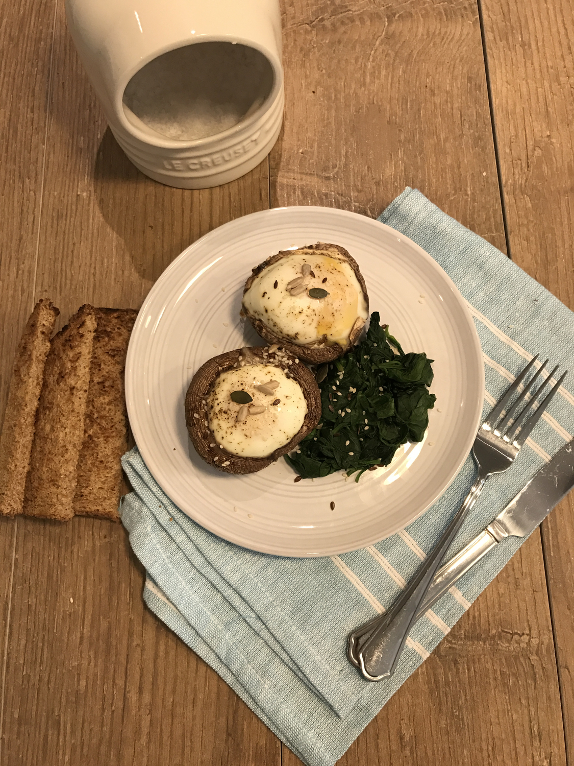 Clean the mushrooms, pull of the stalks and put on a non stick tray. Break an egg in to both mushrooms. Sprinkle half the seeds over the eggs. Bake in the oven at 180C for 18-10 minutes (or until you cook them who you like them) whilst you do something else.