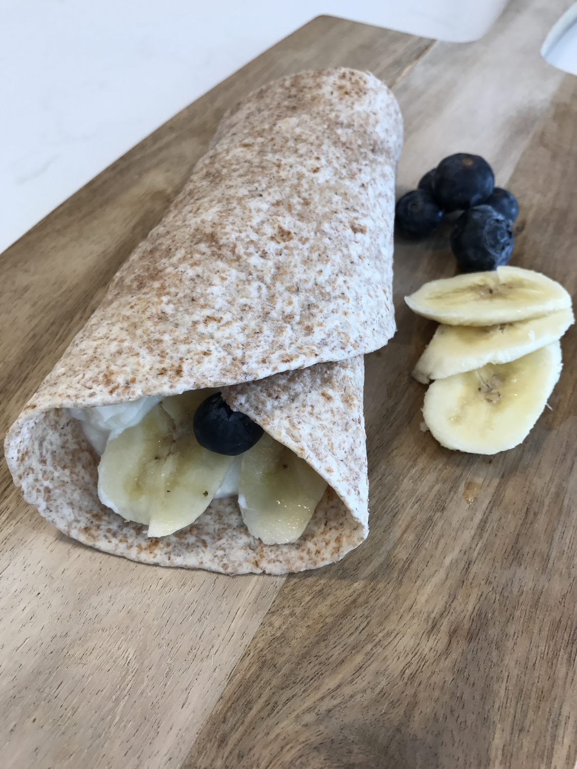 Open the wrap and spread the ricotta over one half. Mash/slice the banana over the ricotta and the mash someone of the blueberries in too. Leave the others whole. The sweetness from the fruits should remove the need for any honey or other sweetner. Sprinkle over the flaxseeds and wrap up.