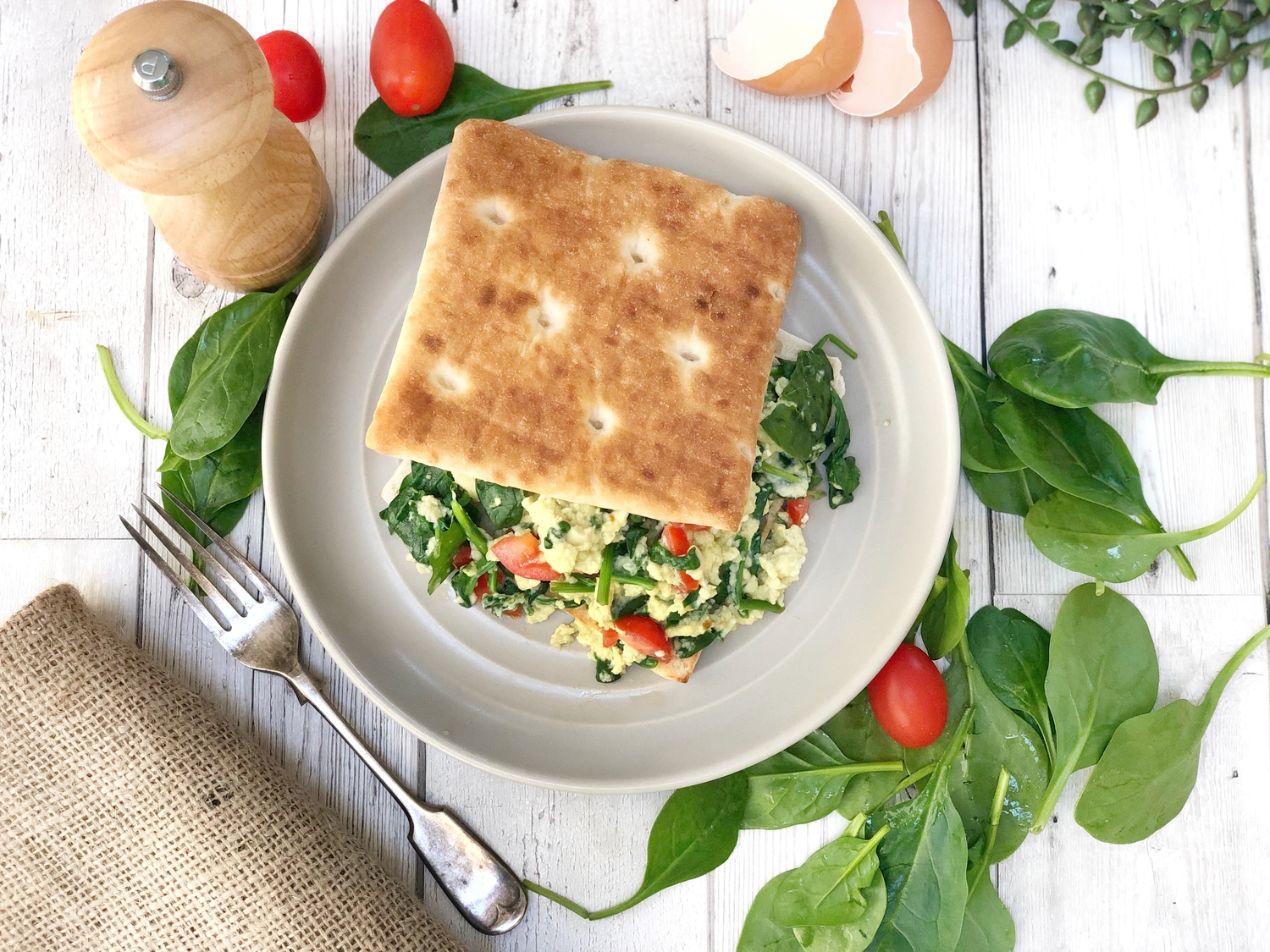 When the spinach has wilted, serve the scramble however you wish between 2 people.