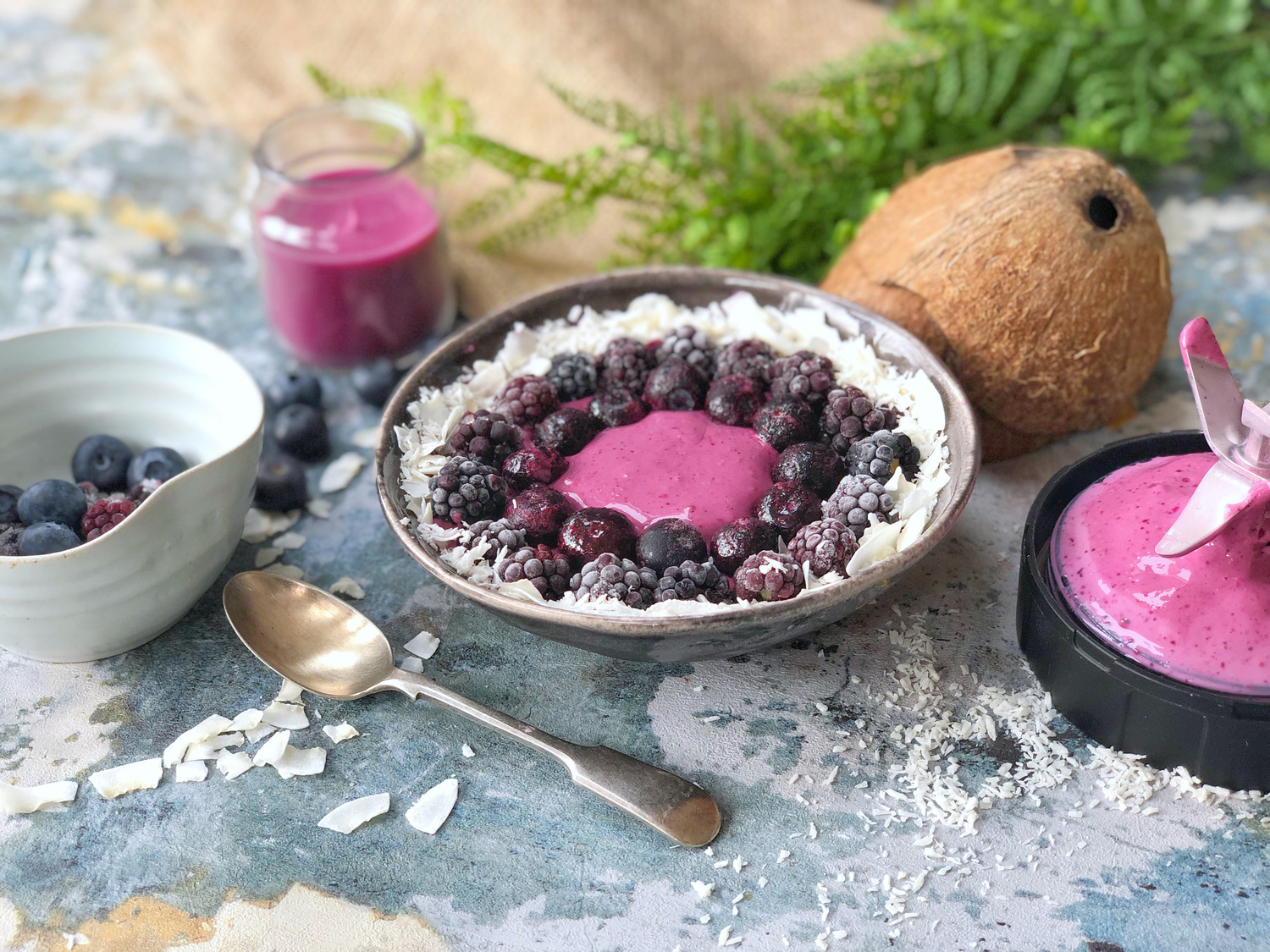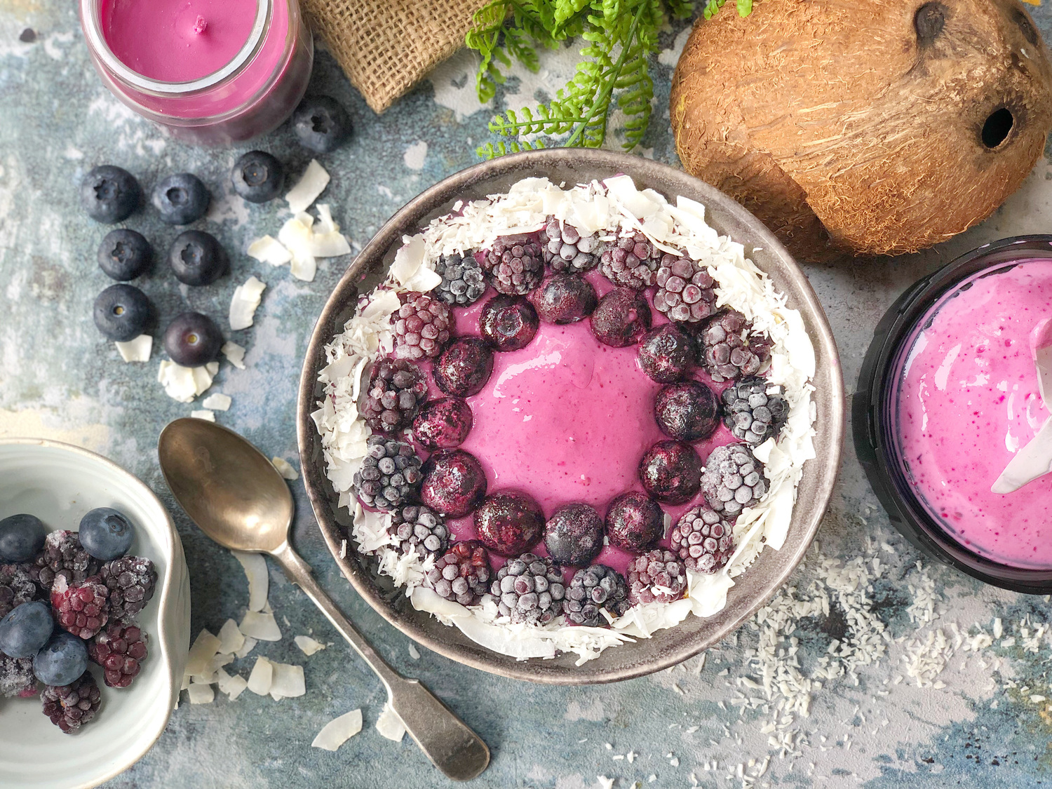 - a selection of frozen or fresh purple fruits, desiccated coconut and flaked coconut