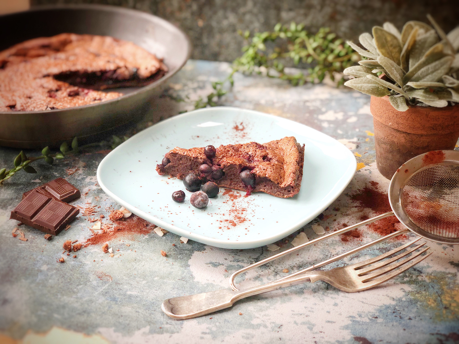 Pour into the hot pan and scatter over the fruit so it is evenly distributed.