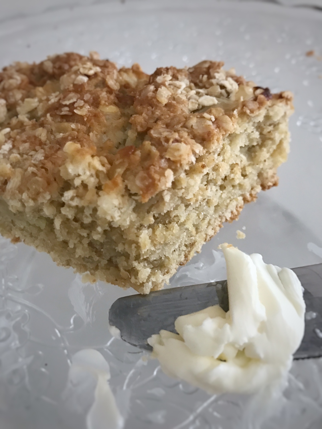 Mix the onions and egg mix in to the dry ingredients. Shape in to a ball and flatten down. Sprinkle some oats on top if liked. Bake at 200 degrees for 30 mins until the bread feels firm and cooked. Cut in to 8 wedges.
