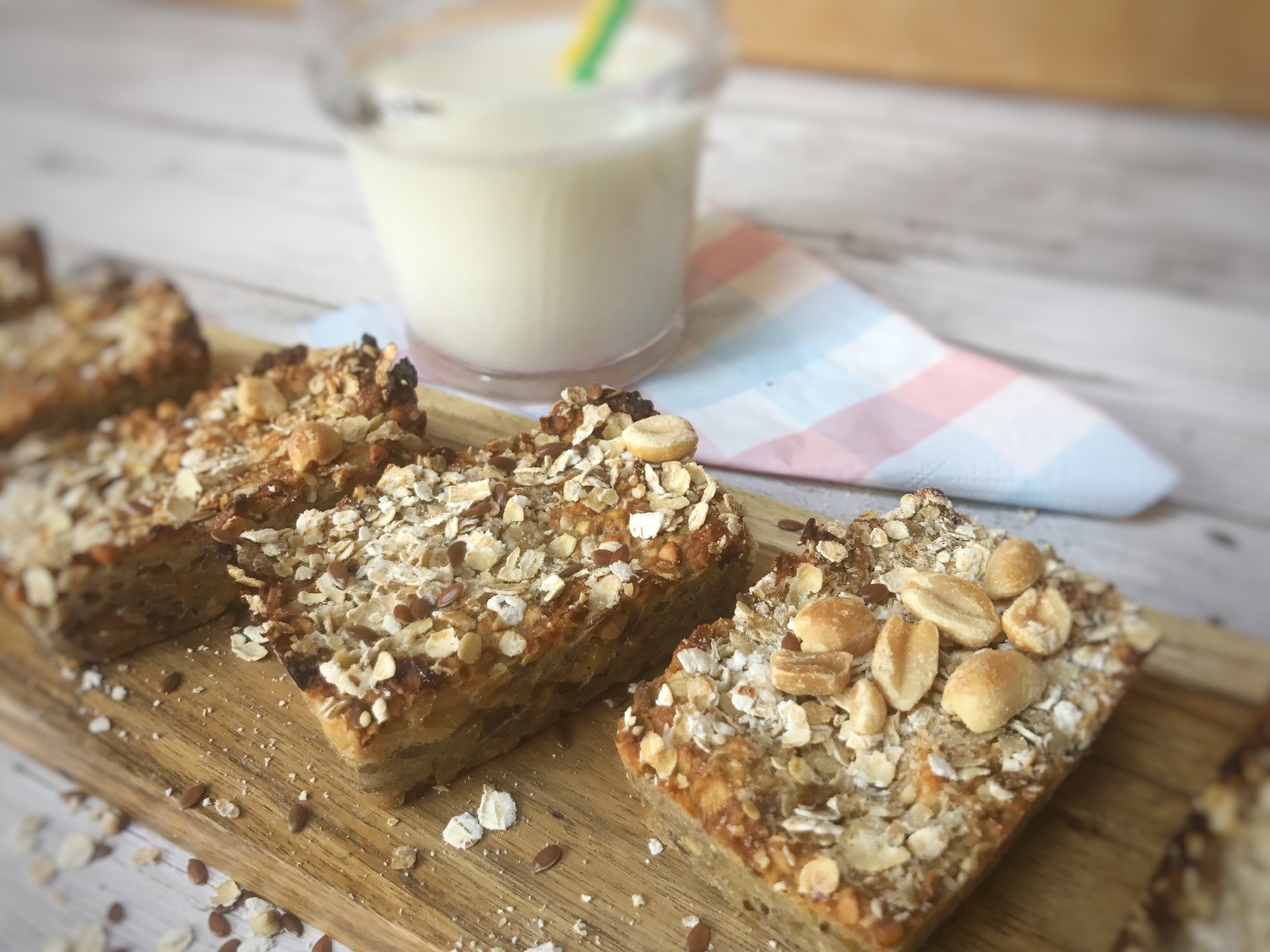 Using a small food bag, bash the peanuts into small pieces with a rolling pin. Add the nuts to a bowl with the buckwheat, linseed and rolled oats. Reserve a few of the peanut pieces.