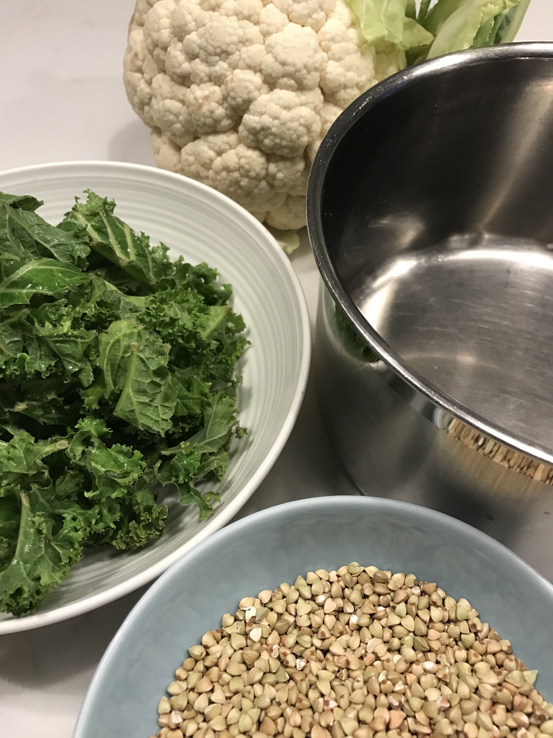 Whilst you're busy doing something else, put bulgar wheat in to medium lidded saucepan. Tip in enough water to double the level of grain in the pan. Stir in the bouillon and salt and bring to the boil. When simmering nicely, add the cauliflower and kale, put the lid on and simmer for 10 minutes.