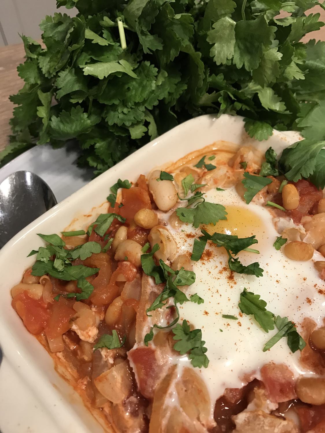 Preheat oven to 180 degree. Heat the oil and sweat the onion and garlic, without colouring a wide, oven proof dish. Add the chill and peppers and continue to sweat to soften. Add the paprika and cook for a further 1-2 minutes. Add both tins of tomatoes and bring to a boil. Add all of the beans and heat through thorough. Take off the heat and make 8 "indents" in to the pepper/tomato mixture. Crack the eggs in and place carefully in the oven. Bake for 8-12 minutes, depending on how set you want your eggs. Serve two eggs per portion and sprinkle over the coriander to serve.