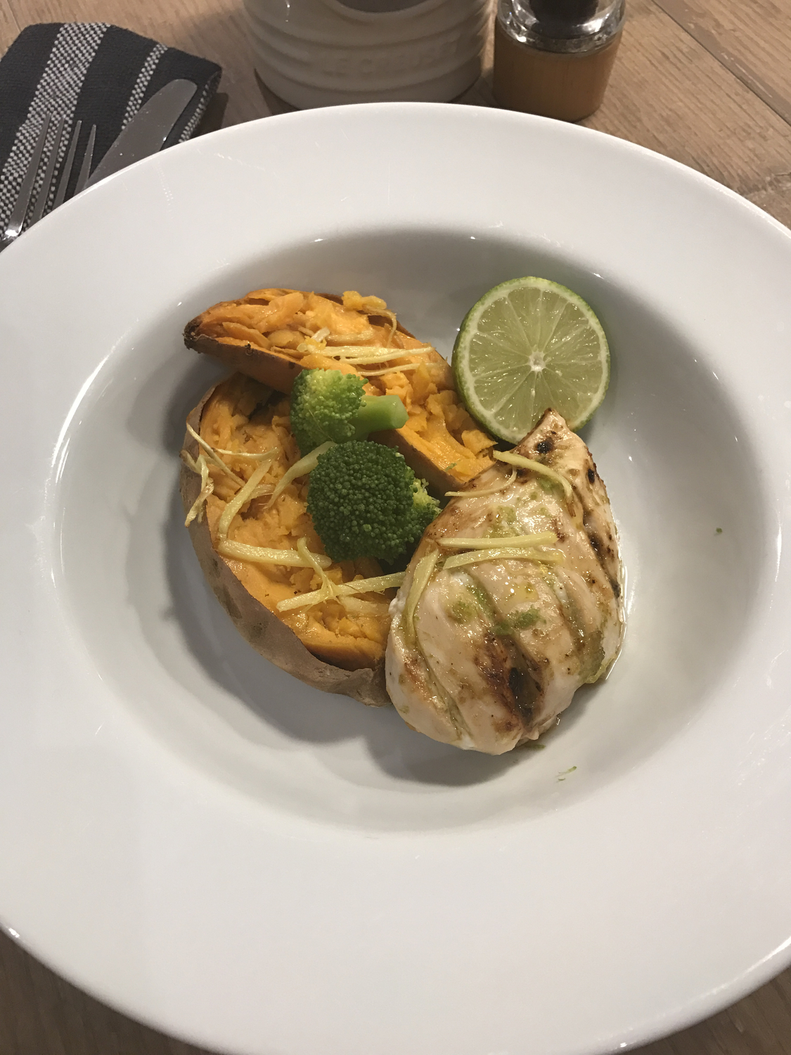 Pre heat the oven to 180 degrees and baked the sweet potatoes for about 1 hour (depending on size) until cooked. 20 minutes before the end of cooking, put the chicken breasts and their marinade in to a shallow baking dish and in to the oven to cook.