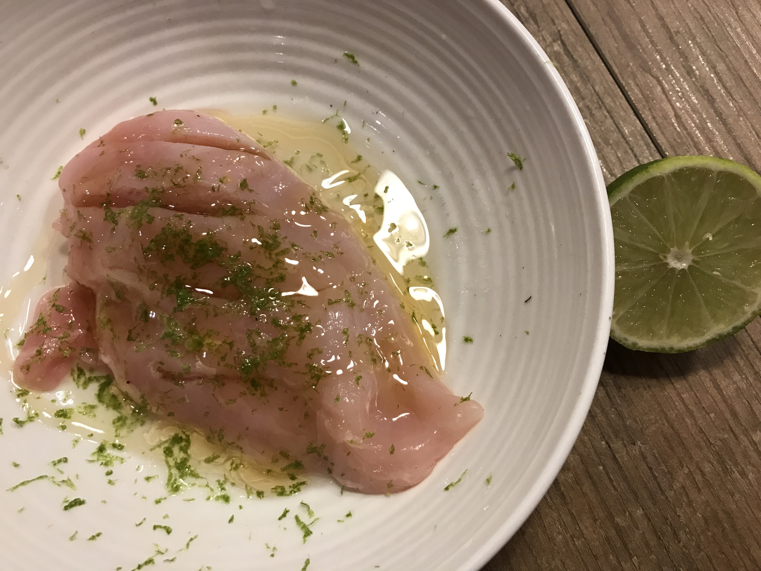 Slash the 2 chicken breasts with your knife a few times. Place in a non-metallic dish and mix over the lime zest and juice, honey, 3 tbsp water and 1 cm of the ginger root (grated). Leave over night if possible.