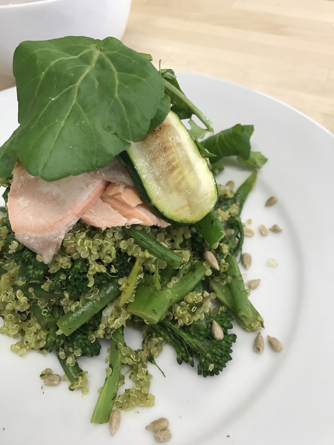 To assemble, mix the dressing in the quinoa (reserving 1 tbsp). Stir through the spring onions and gently add the vegetables. Dish the mix up between 4 plates. Flake the salmon in to chunks and divide over the top of the quinoa. Top with the fresh watercress leaves and sunflower seeds and a drizzle of the remaining dressing.