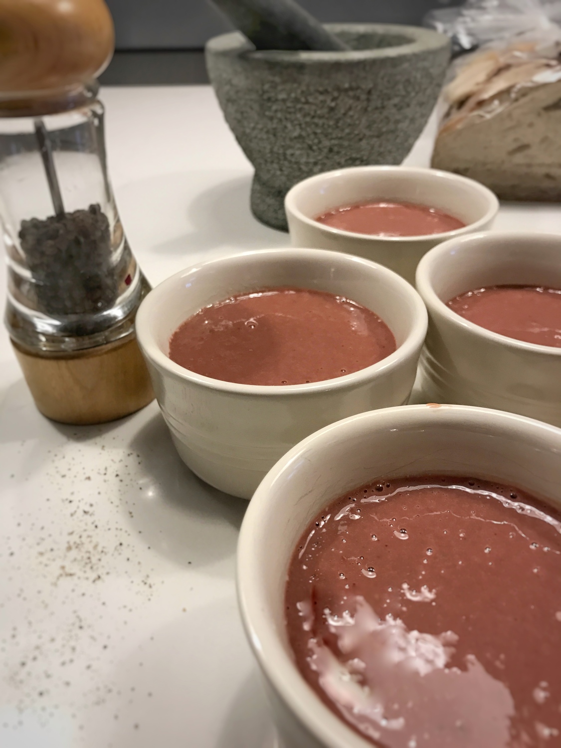 Whizz it all up in a blender - chop a bit before if your blender is a bit of a dinosaur. Grease 6 ramekins and divide the mixture between them. Fill a deep baking tray with boiling water and place ramekins inside (water should be at least half the way up the dishes). Bake at 160 degrees for 20-25 minutes until they feel springy to touch.