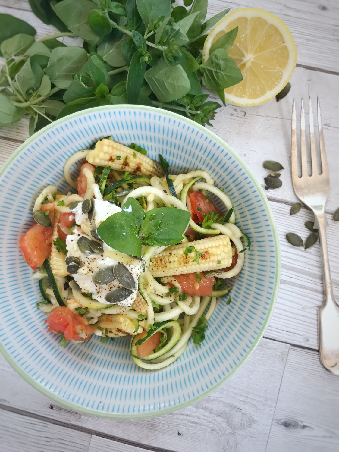 Heat the oil on a griddle pan and chargrill the baby sweetcorn until crispy. Add the chopped tomatoes to the same pan and heat until soft and breaking down. Remove the pan from the heat and place the courgetti in to the pan. The residual heat will soften the courgette enough for the dish. Stir through the chopped herbs.