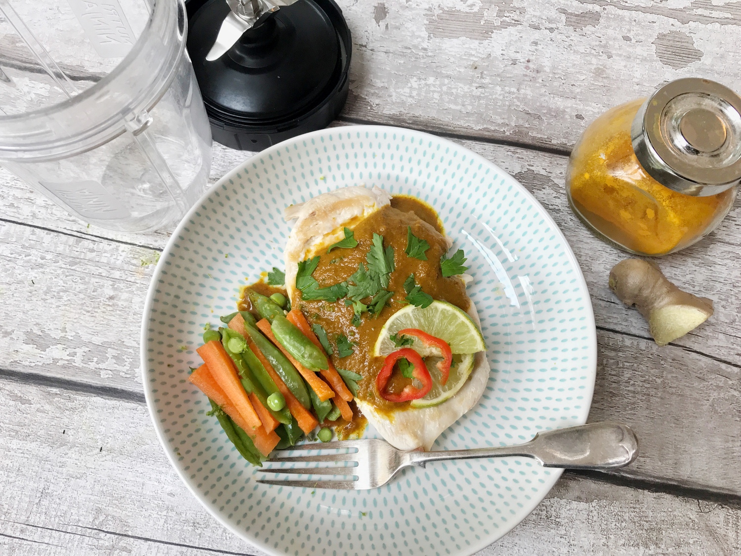I would like to suggest that there is a way to make a pretty hot, low fat, creamy, yet spicy sauce for your chicken breast as it merrily charrs itself on the griddle. No fine chopping needed, no pre-frying, oil, sugar or ready made jars of sauces here! You could toast the spices a little before putting into the blender, but time sometimes just demands you get the meal out quick!