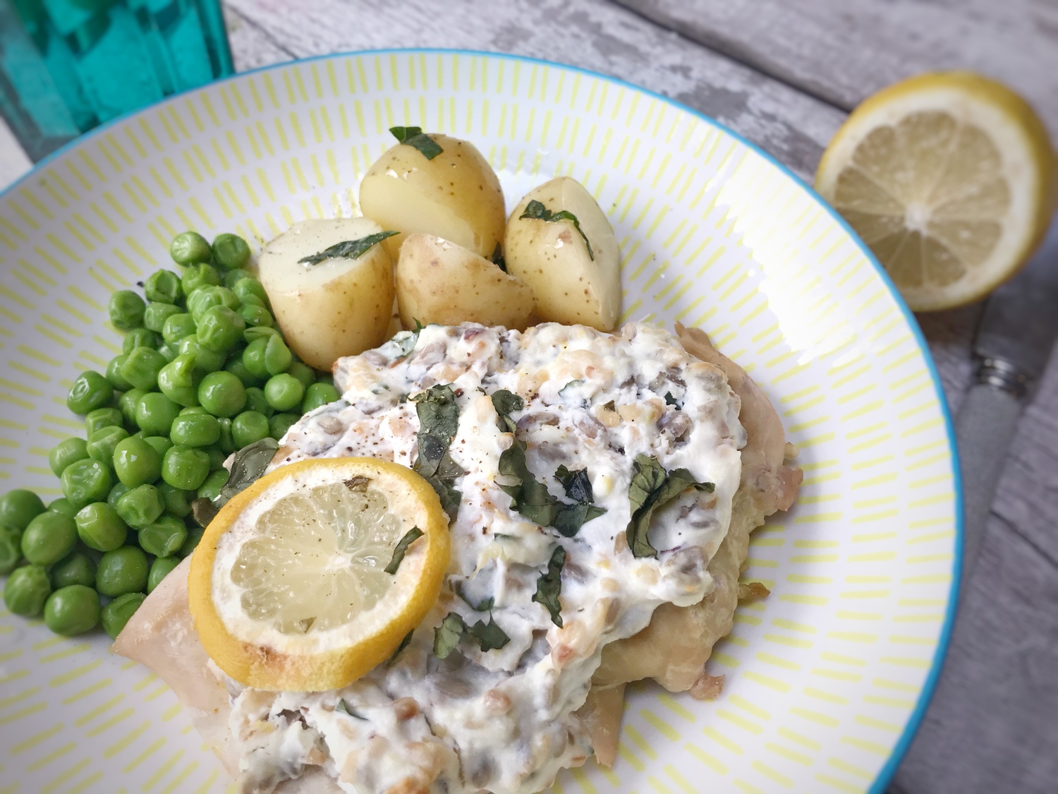 Mix the rest of the ingredients together and spread on top of the chicken. Bake for 15-20 minutes until the top is bubbling and toasty and the chicken cooked.