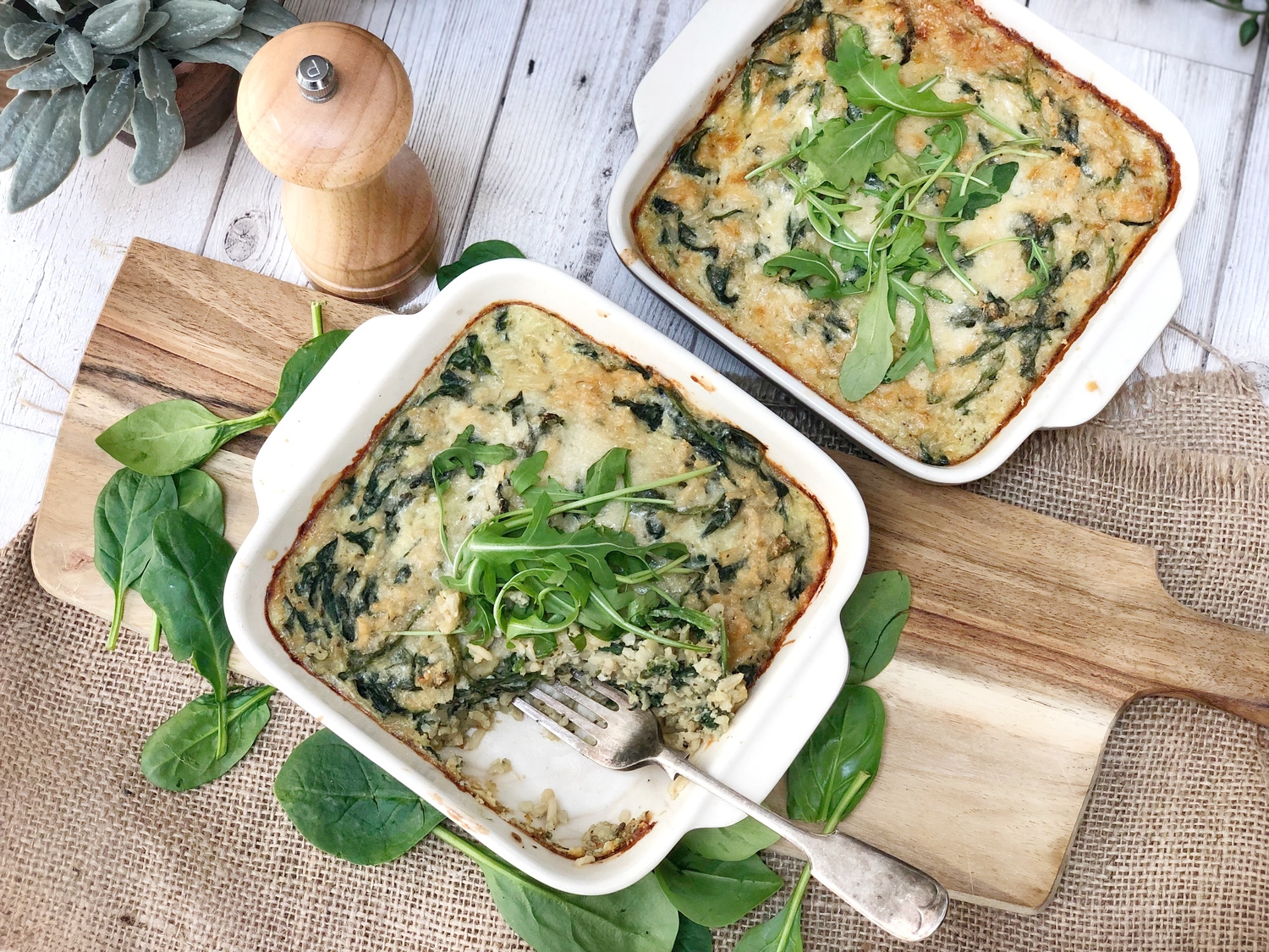Pre-heat the oven to 220°C/Gas Mark 7 and grease two small casserole dishes (or 1 large one).