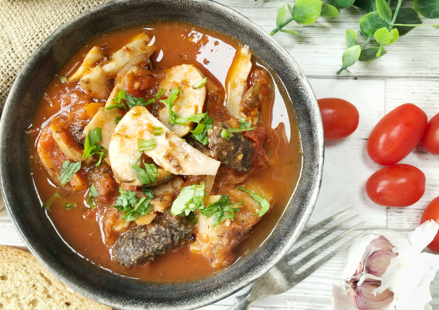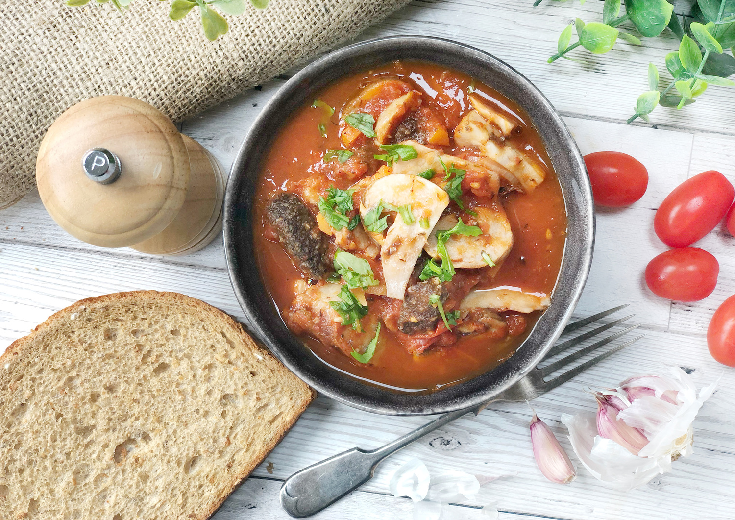 Tip in the tomatoes, fennel, thyme and salt and stir together. Add the sausages, bacon and black pudding and bring to a simmer.