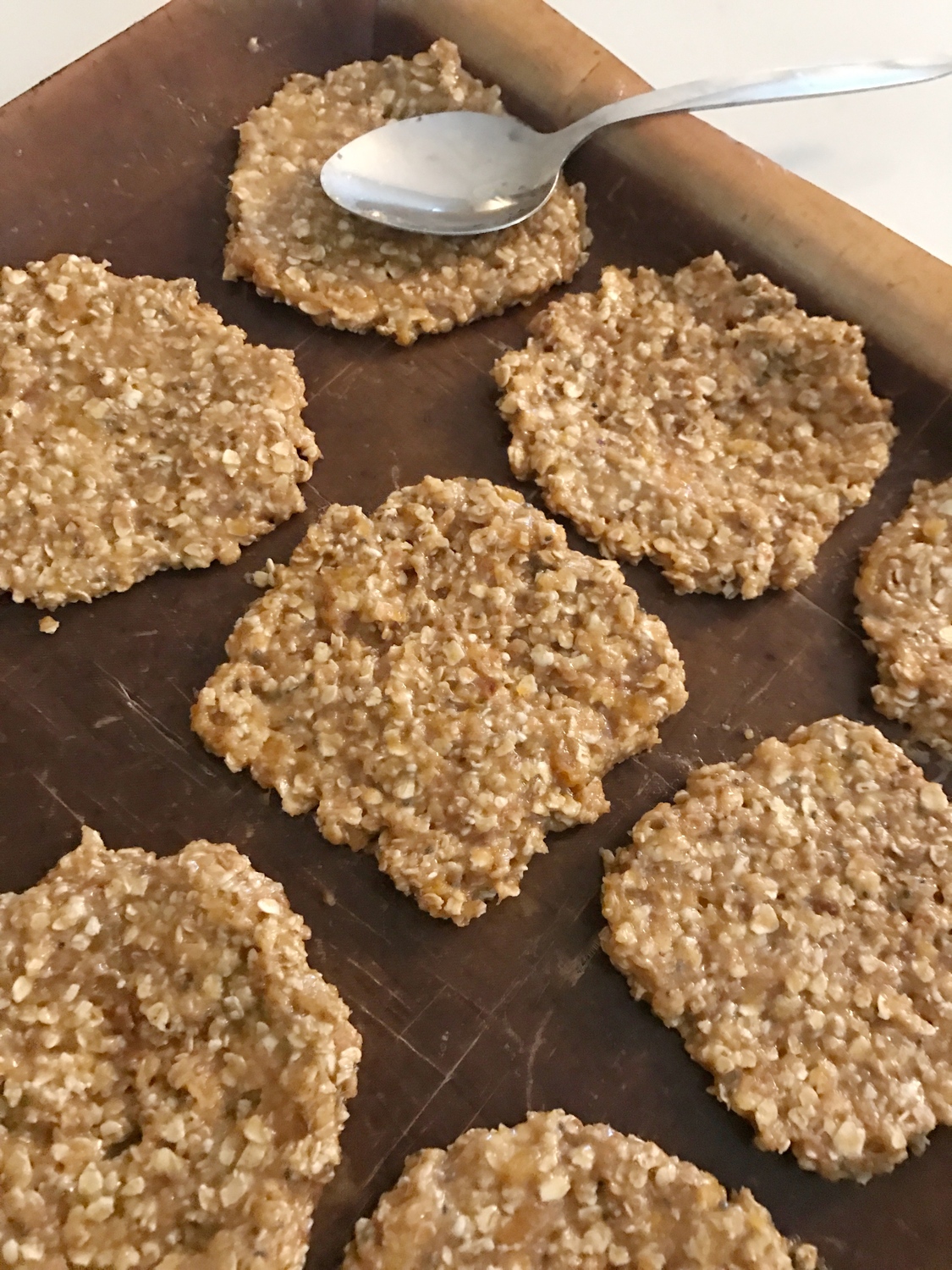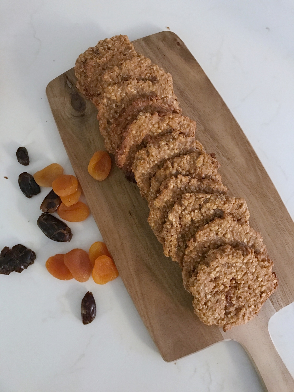 Heat the oil, apricots, dates, water/juice, syrup and honey in a medium saucepan. Simmer for 10 minutes and then use a hand blender to create a smooth, sticky mixture. Add the dry ingredients and the beaten egg. Mix thoroughly and then blob 15 spoons of mixture on a baking sheet. Use the back of a wet spoon (keep dipping in a cup of water), squash each spoonful down to create a lovely thin, flat biscuit. Bake at 180 degrees for 20 minutes until crisp and golden. Cool on a rack - these become lovely a chewy as they cool.