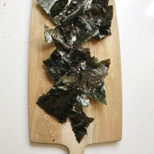 Flick a bit of water over the sheets and press two together to make a double thickness sheet. A bit more of a flick of water over the top and the sesame seeds will stick. Place on a lined baking sheet and bake in the oven for 6-8 minutes at 200 degrees The sheets go paler in green and really crispy. Don't go overboard with the water, I did a couple of times and ended up with a re-hydrated piece of chewy seaweed (still not overly unpleasant, but...).
