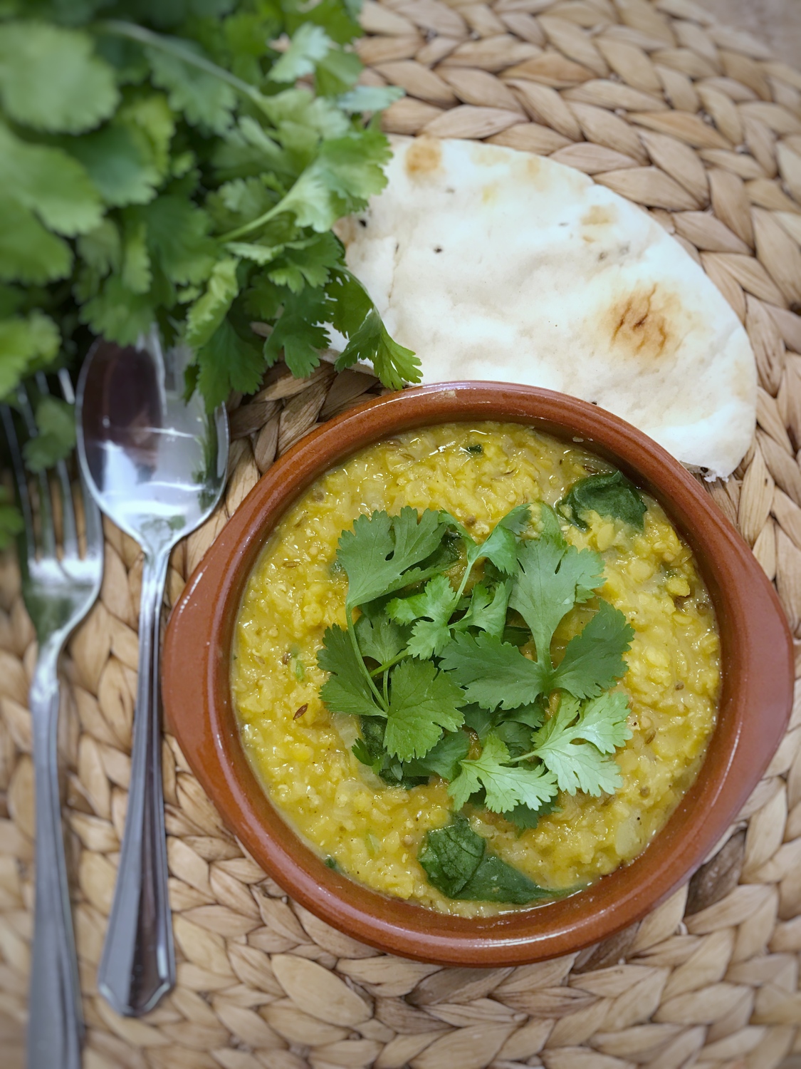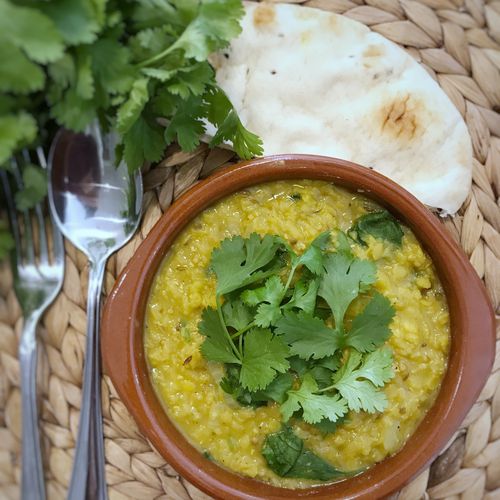serve the dahl with the naan on the side and coriander on top.